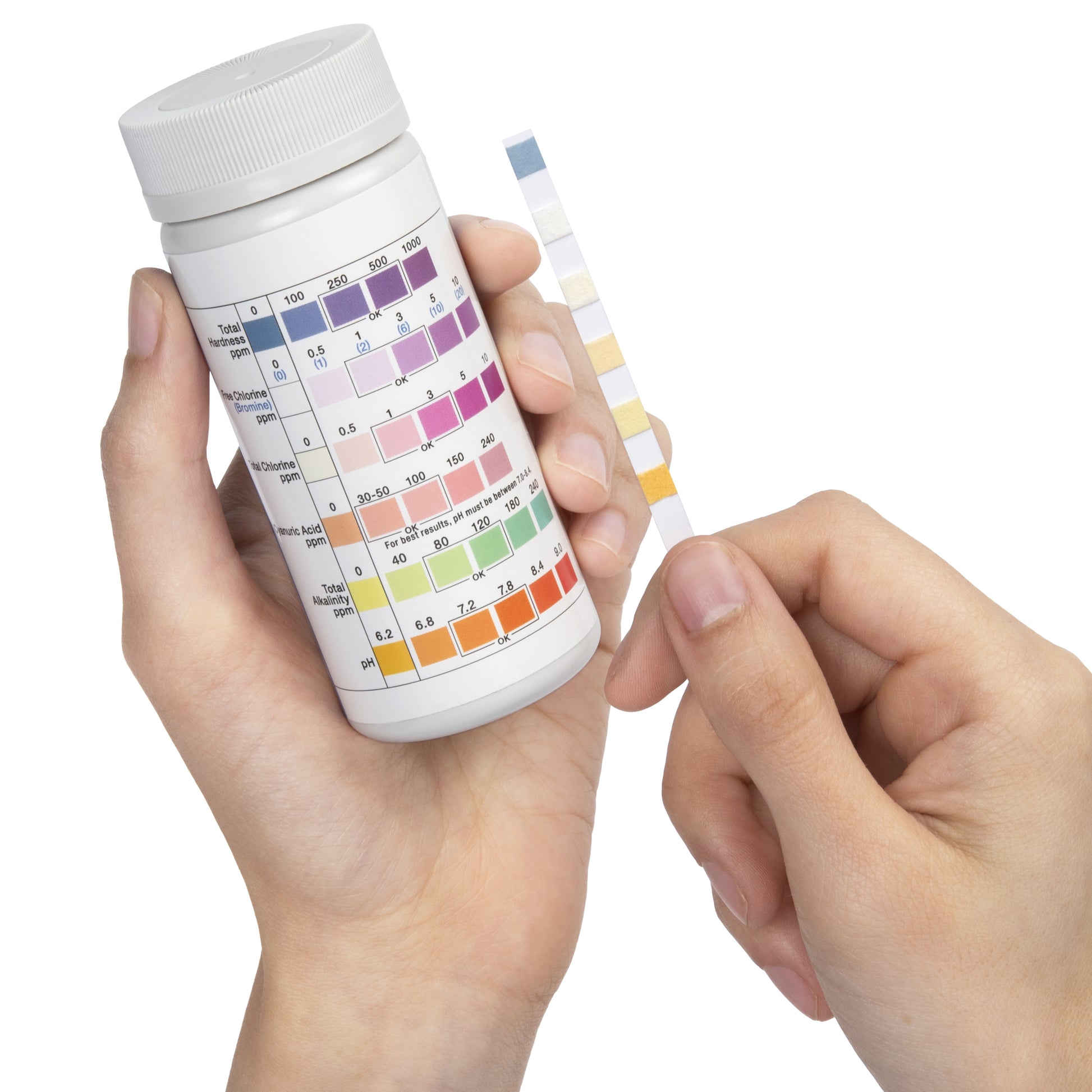 - 💧 [ 120 ALL-IN-ONE TEST STRIPS ] Monitor Total & Free Chlorine, Hard Water Test for Total Hardness, Bromine , Total Alkalinity, pH, and Cyanuric Acid levels for a complete assessment of water quality. Simplify your water testing process with this all-in-one solution that covers all essential aspects of water quality