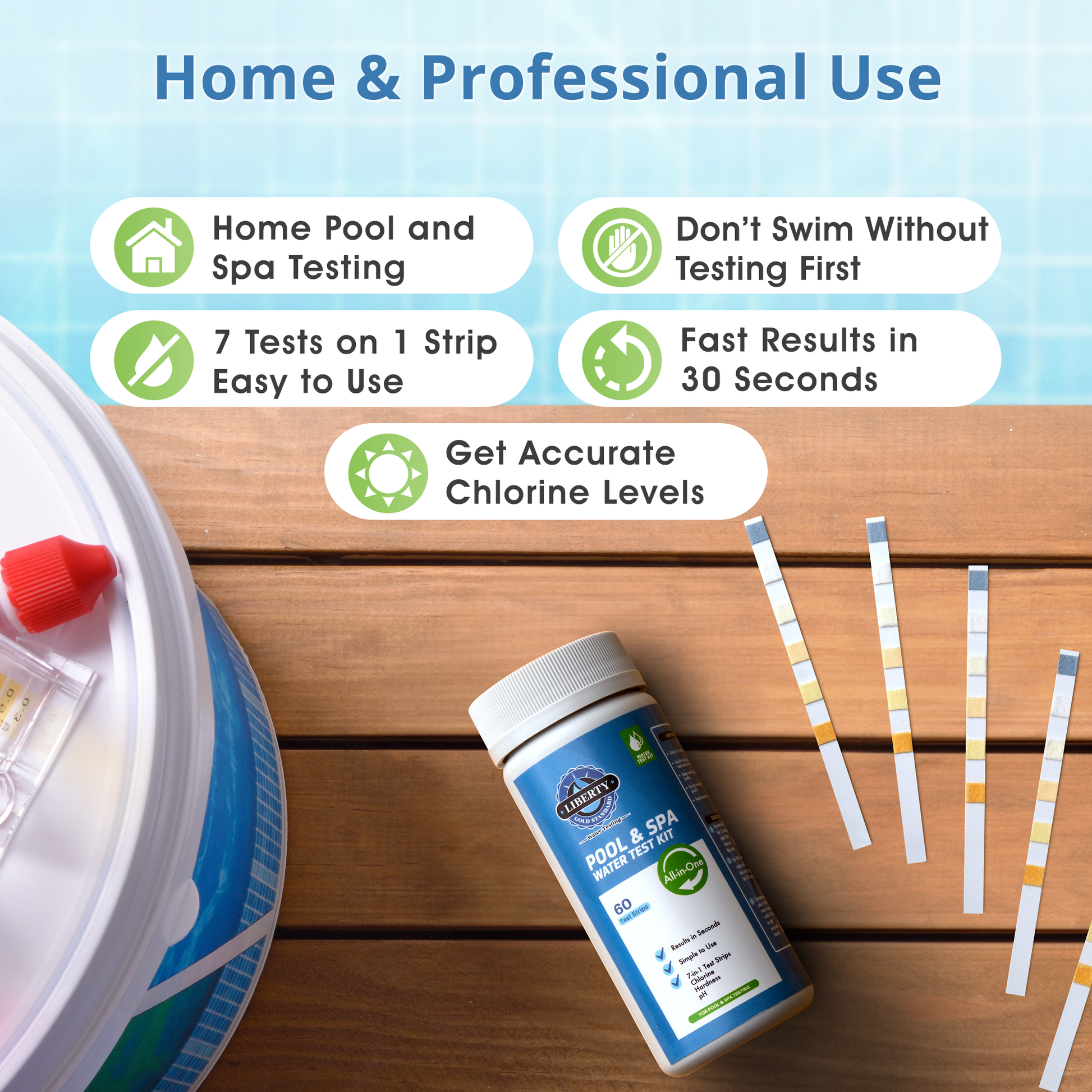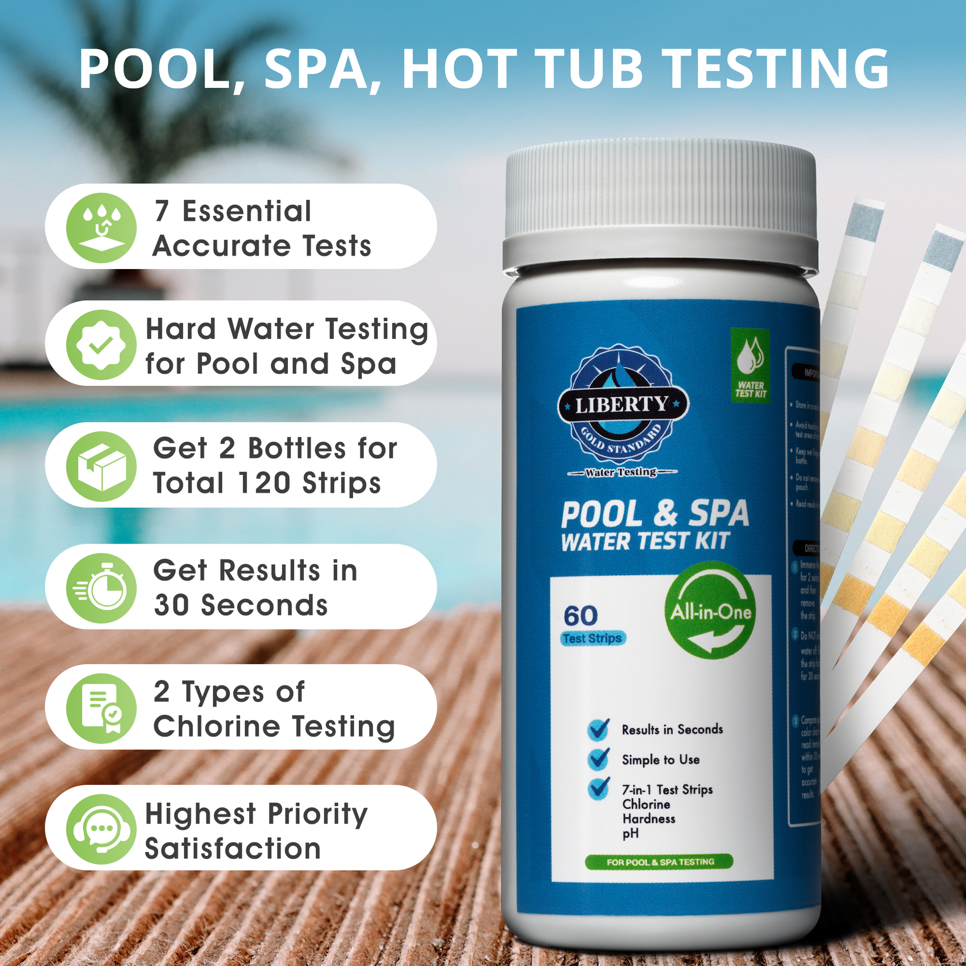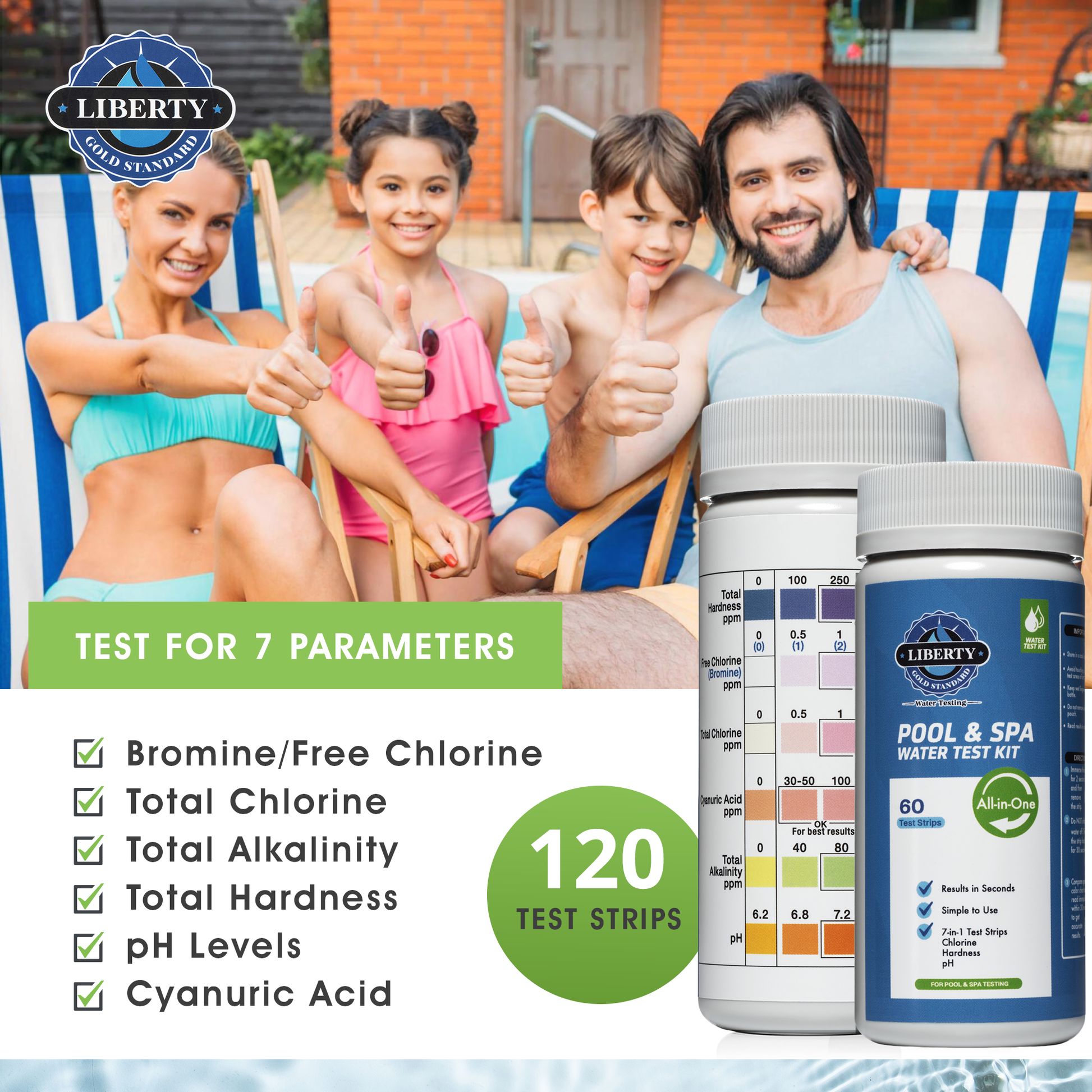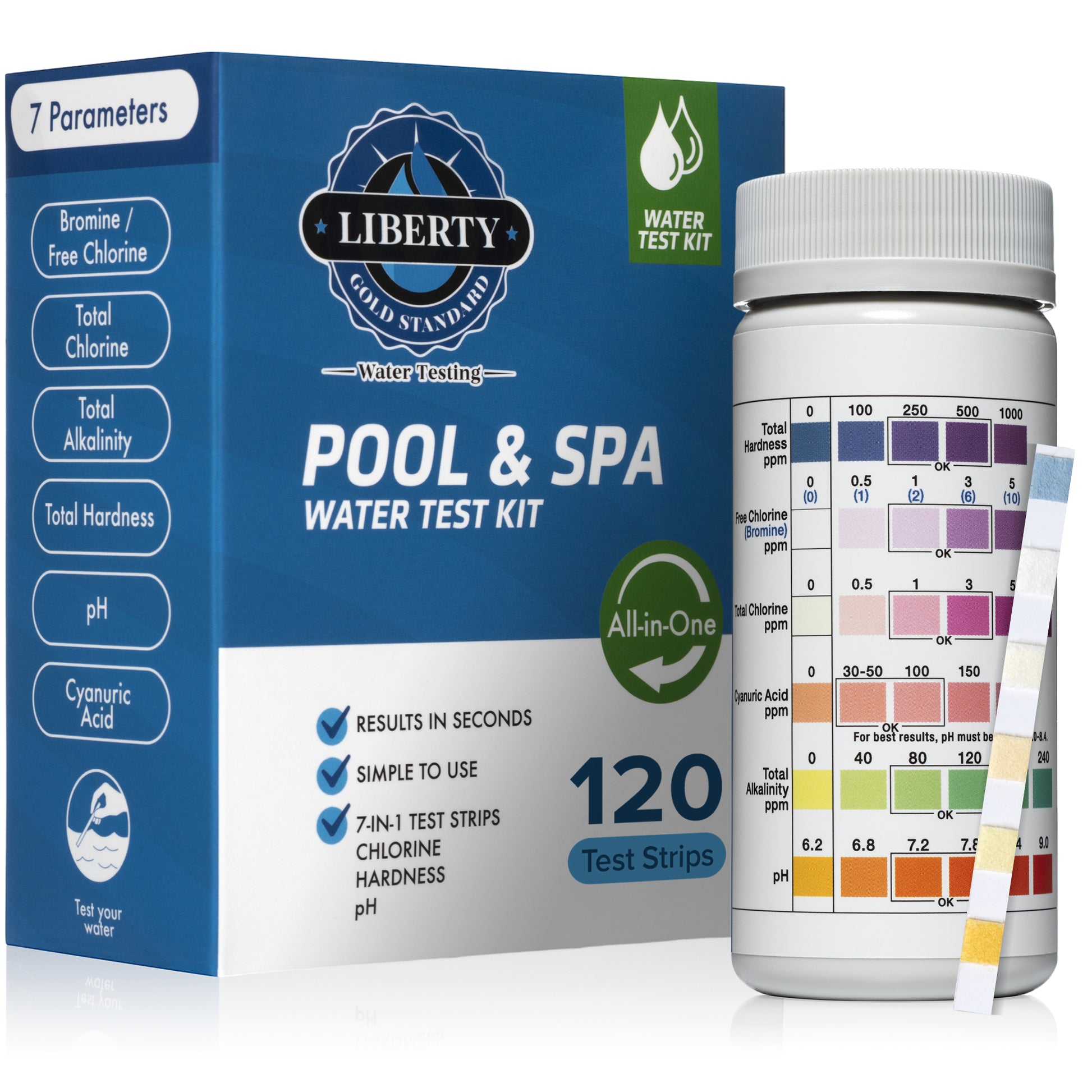 - 💧 [RESULTS IN 30 SECONDS ] With the Liberty Gold Standard Pool, Spa / Hot tub Test Strips, you can quickly and precisely assess the quality of your pool or spa water. In just 30 seconds, you can effortlessly test for 7 essential parameters, keeping your pool or hot tub in prime condition.