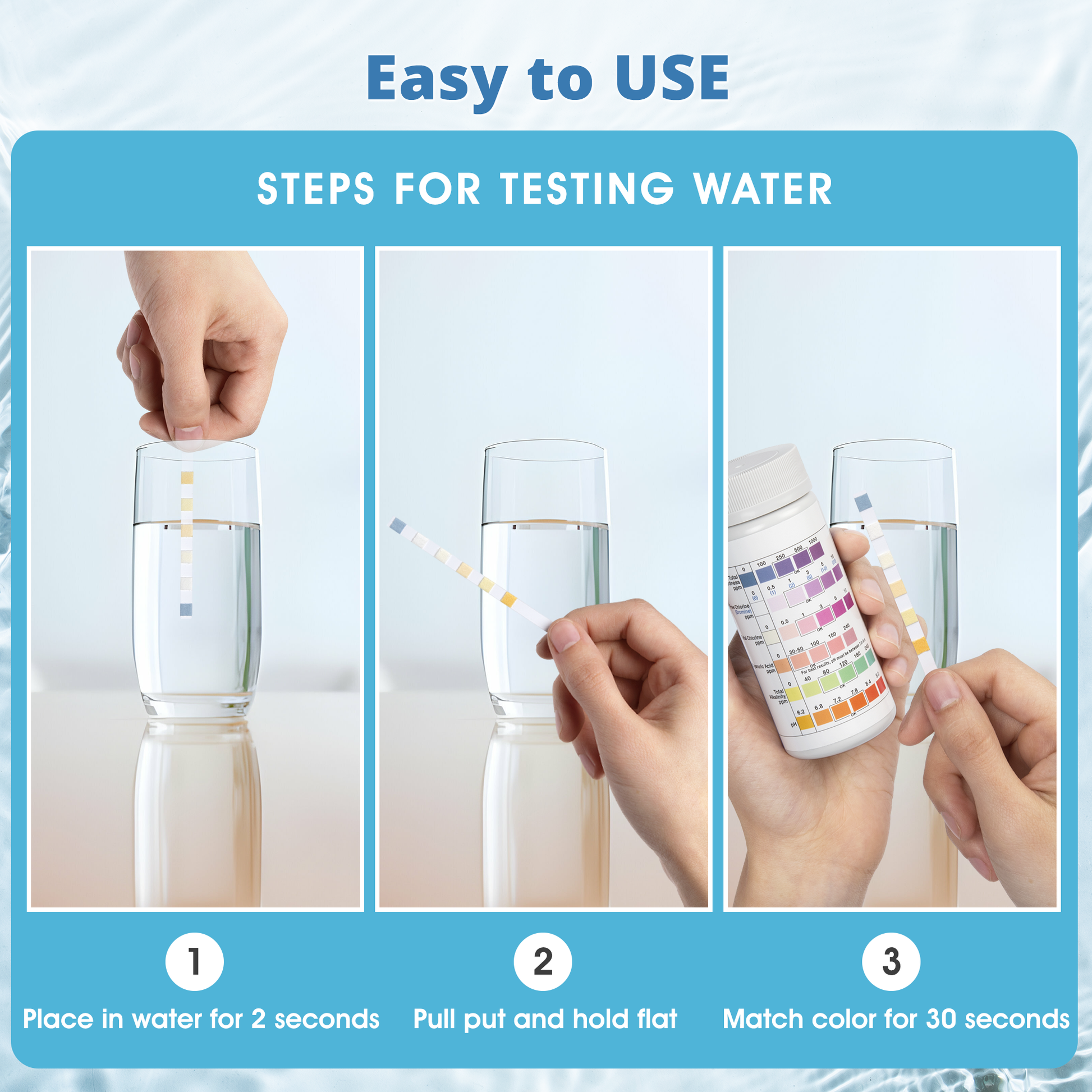 - Immerse test strip in water for 2 seconds then remove without shaking